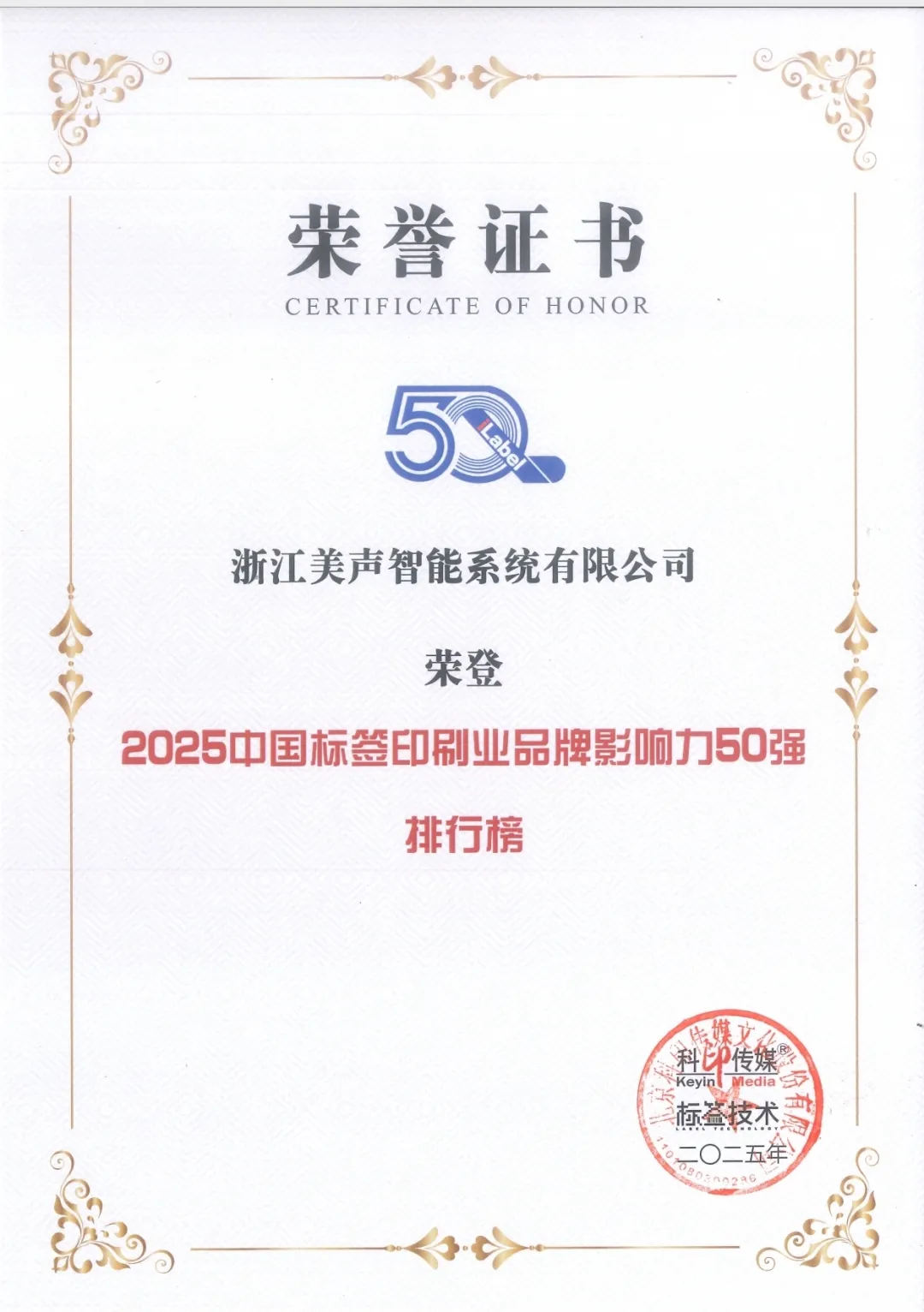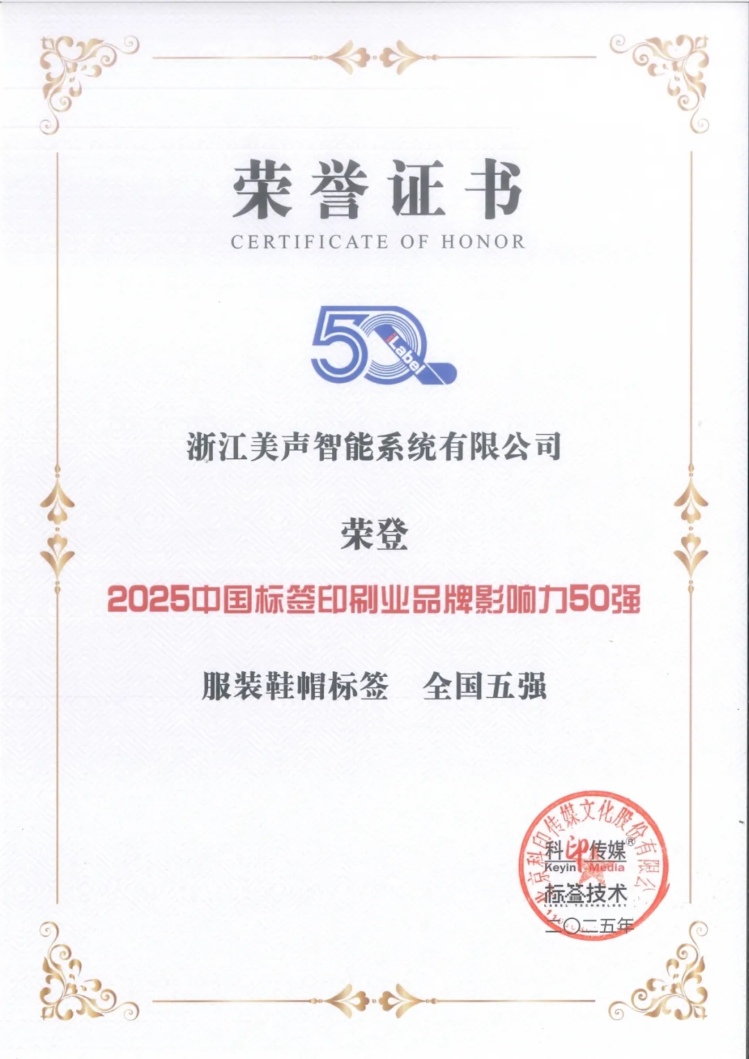 近日,由《标签技术》编辑部主办的第四届“中国标签印刷业品牌影响力50强排行榜”评选结果正式揭晓。美声集团凭借卓越的品牌实力、强大的市场影响力以及持续的创新能力,连续四年荣登“中国标签印刷业品牌影响力50强”榜单,在服装鞋帽标签细分领域再次获得了“全国五强”,彰显了其在标签印刷领域的领军地位。